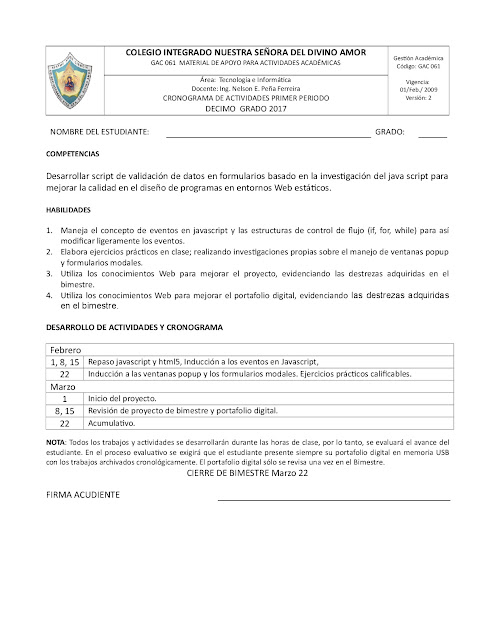 Marzo 8 del 2017 Iniciamos el proyecto del primer periodo, con las siguientes pautas: 1. Pueden terminar el proyecto en Casa, basado en la copia de seguridad del grupo. 2. Los integrantes del grupo NO SE DEBEN REUNIR, cada uno debe trabajar desde su casa y comunicarse en horarios normales (6 a.m. hasta 7:00 p.m.) con sus compañeros de grupo. 3. No se admiten quejas sobre el hecho de haber trasnochado, lo que hace falta del trabajo deben realizarlo en grupo. 4. El día 2017-03-15, deben entregar la usb marcada(Primer Nombre, Primer Apellido), junto con la carpeta que se indico en clase. 5. El trabajo debe contener todas las recomendaciones que indico el docente en clase. 6. Se pedirá dicho trabajo a cualquier integrante del grupo. 7. Al inicio de clase se entregará el trabajo, no existirá tiempo para correcciones, debido a que ya fueron realizadas en casa por cada uno de los integrantes del grupo. 8. Cada integrante debe tener documentación sobre su proyecto en la usb, cuaderno y...
